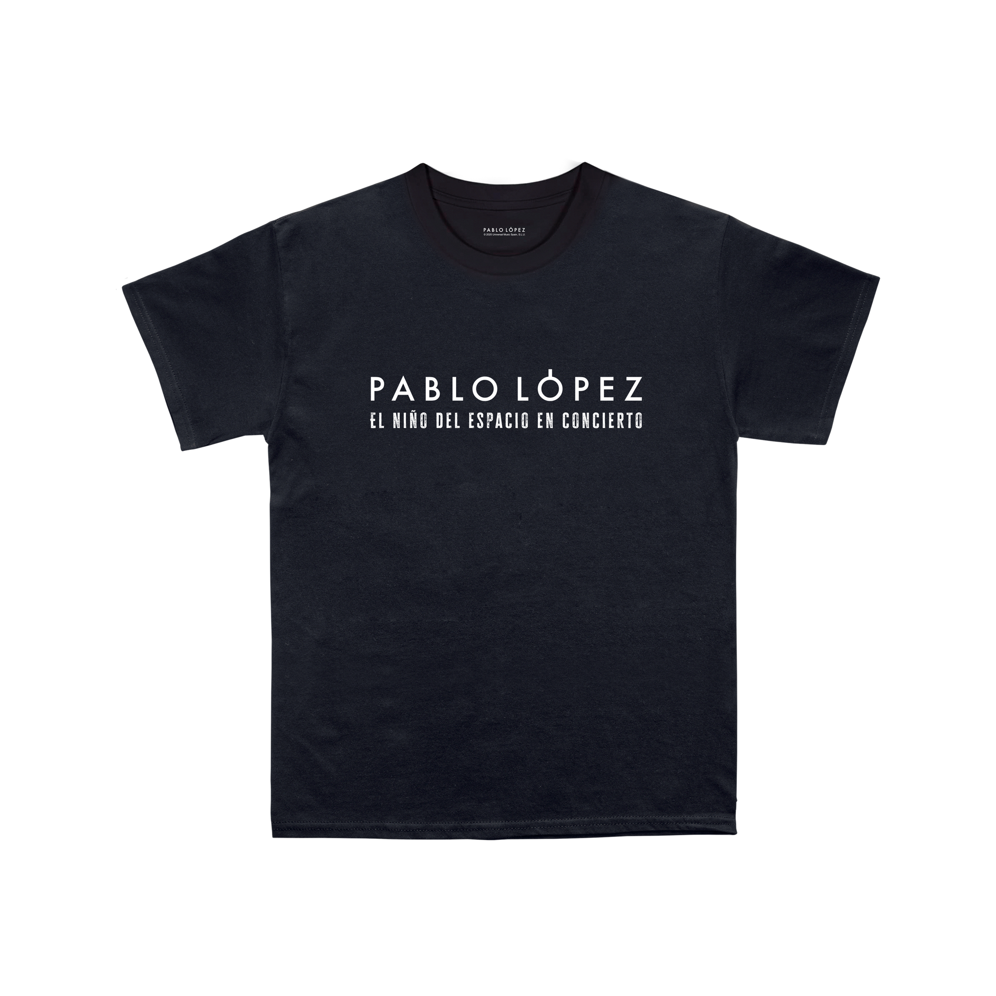 Camiseta negra con el nombre de Pablo López y el título de la gira “El Niño del Espacio En Concierto” en el frente, y todas las ciudades de la gira formando la silueta de un cohete en la espalda. Una prenda que captura ese instante justo antes del despegue. 🚀