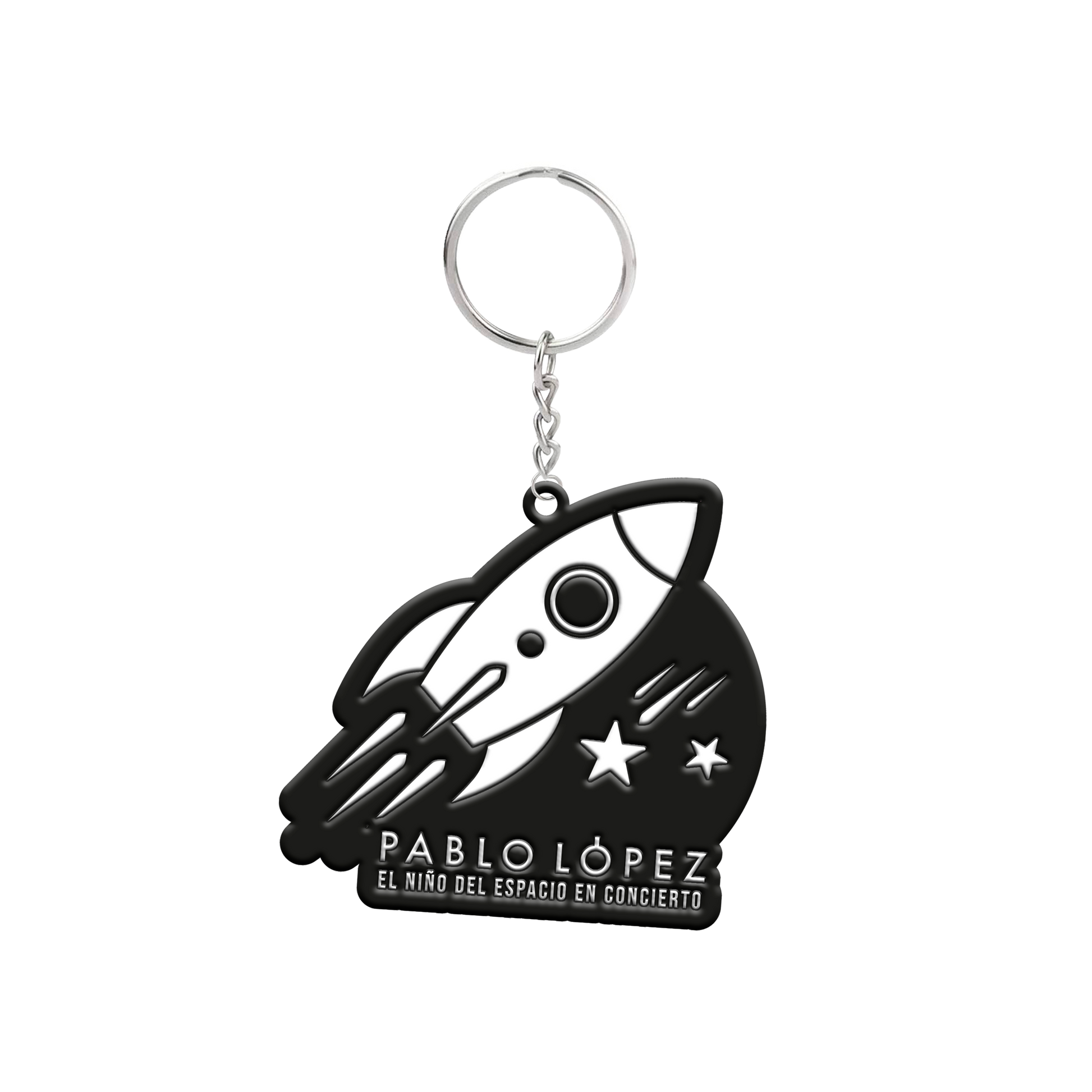 Llavero en forma de cohete con el nombre del artista y el de la gira “El Niño del Espacio En Concierto”. Una pieza que despega con él. 🚀